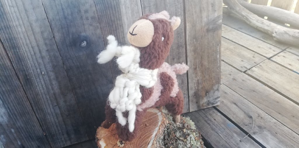 HECHO A MANO EN TELA PELUDA Y PATAS DE MADERA, TIENE UNA BUFANDA DE LANA. TAMAÑO 25 CMS